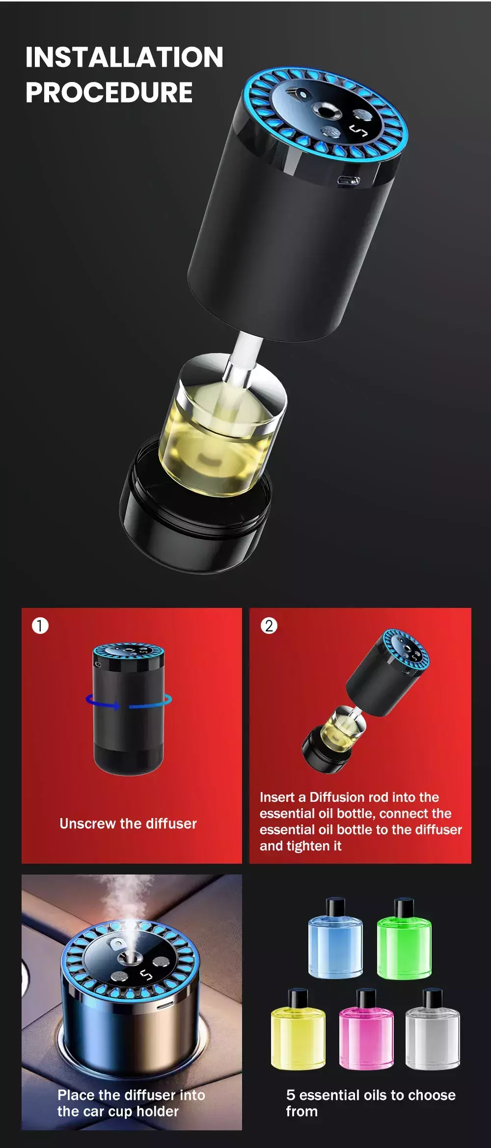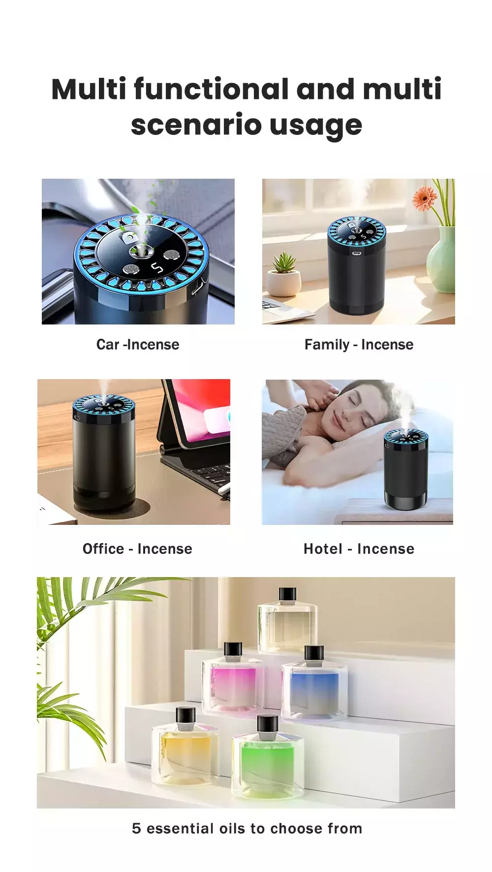 Este difusor oferece 5 modos diferentes de spray, permitindo o controle ideal da intensidade do aroma para atender às suas preferências e necessidades. Além disso, conta com uma luz noturna colorida que emite suaves tonalidades, criando um ambiente acolhedor e perfeito para momentos de relaxamento ou meditação.