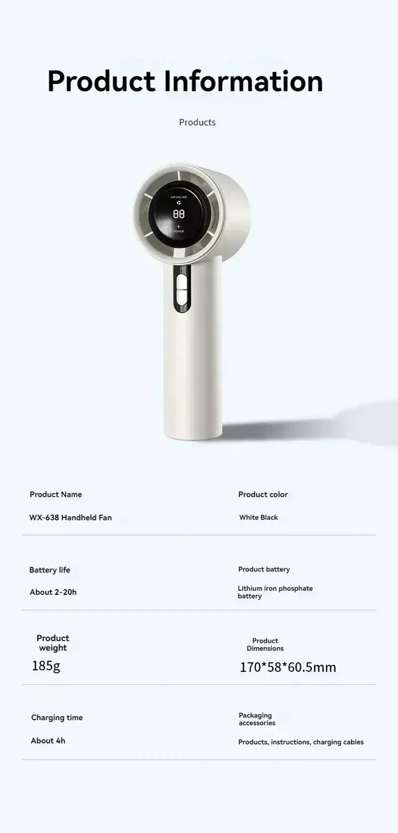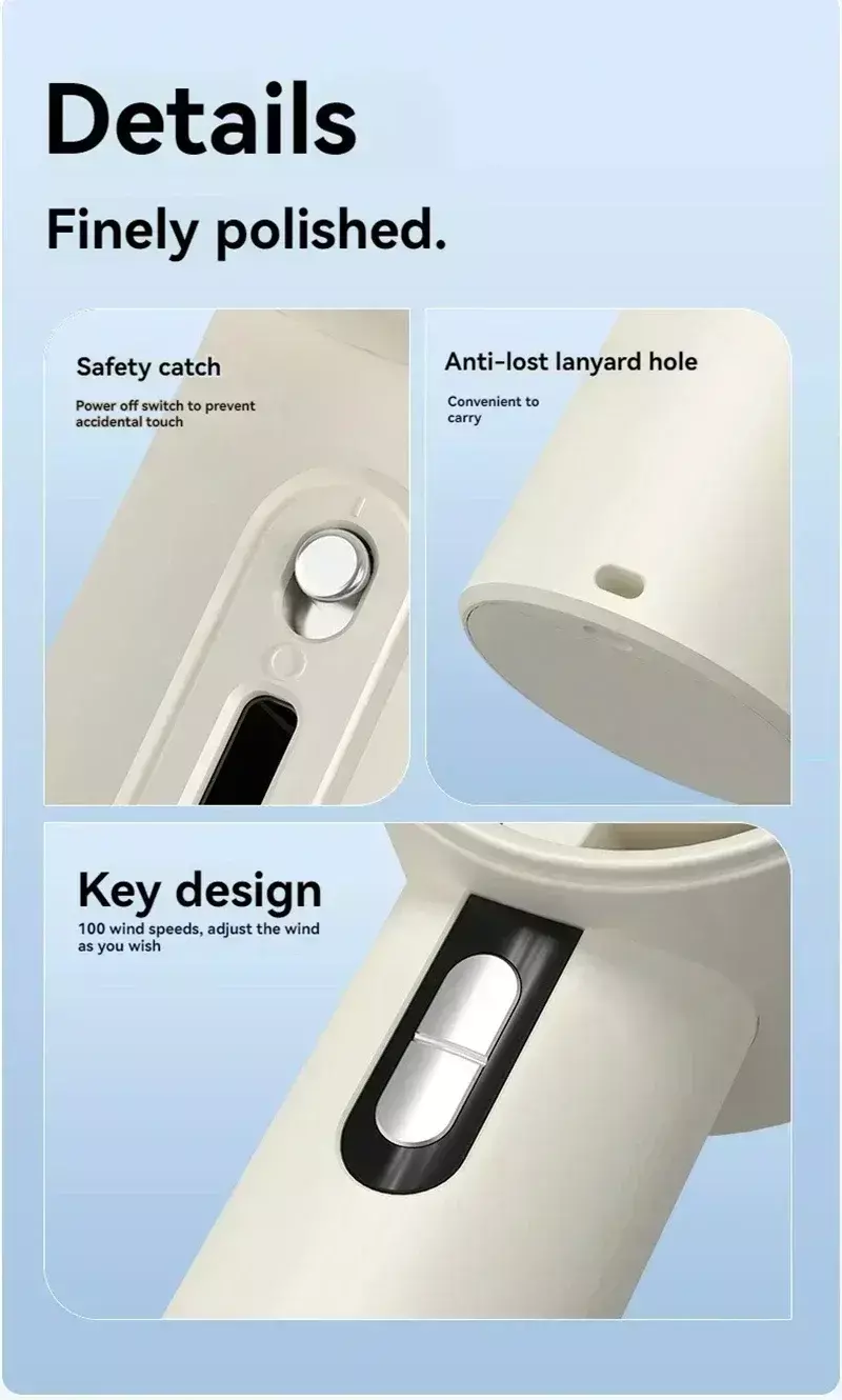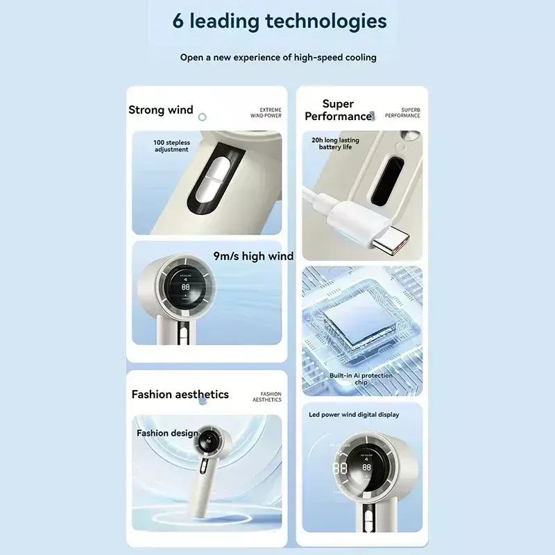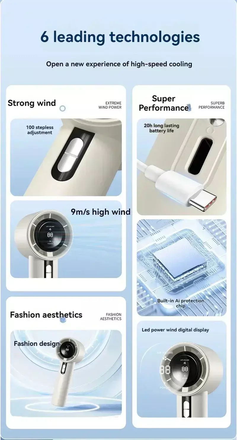 O Ventilador Portátil Turbo 2025 é equipado com tecnologia de ponta para garantir um fluxo de ar potente e refrescante. Suas hélices eficientes protegem um vento forte e fresco, permitindo que você desfrute de uma brisa agradável mesmo nos dias mais quentes. Leve e portátil, é ideal para uso em casa, no trabalho, durante os exercícios físicos ou em viagens. Tenha o frescor sempre à mão, sem preocupações! 🔋
